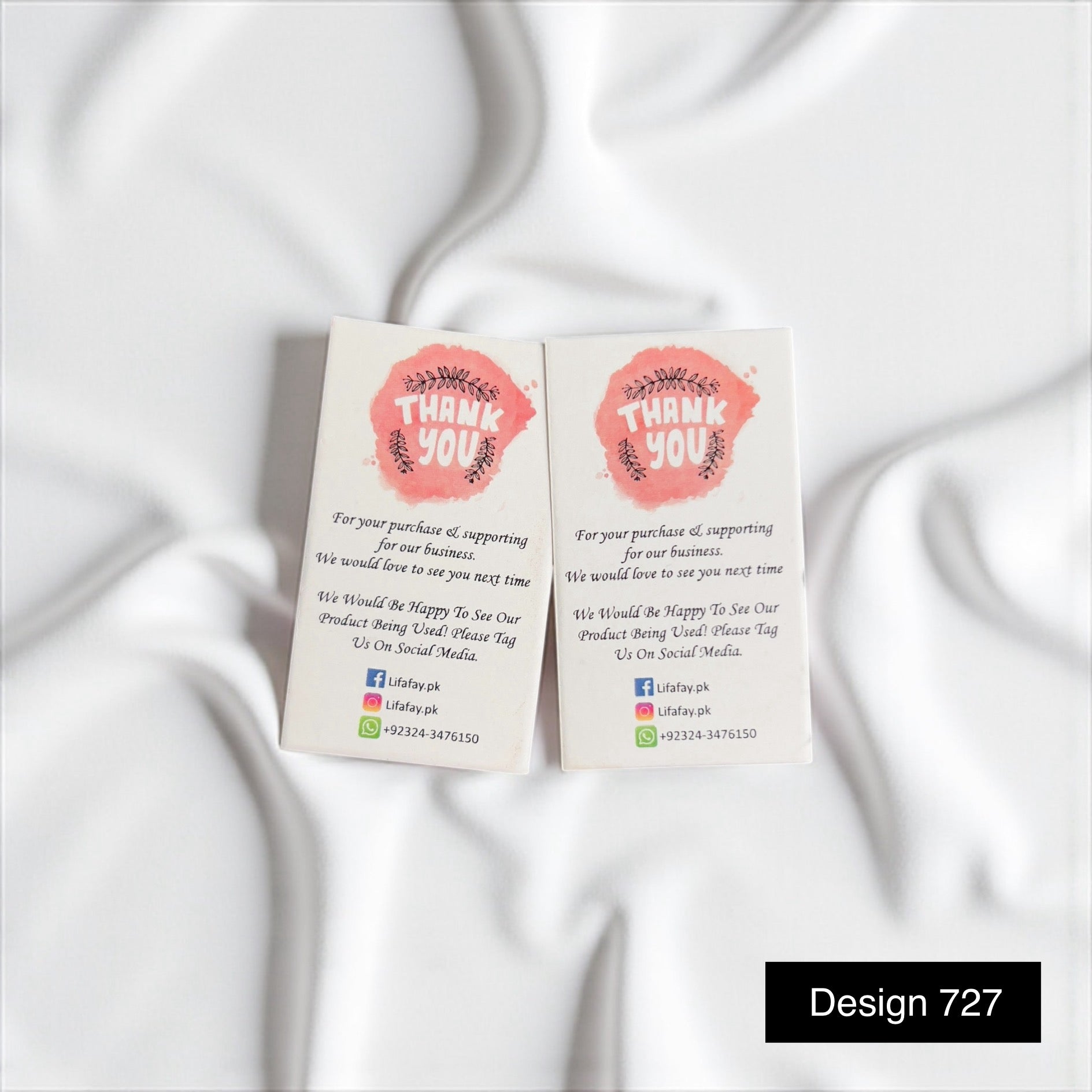 Thank you cards are 3.5 x2 inch card with sticky tape at the back